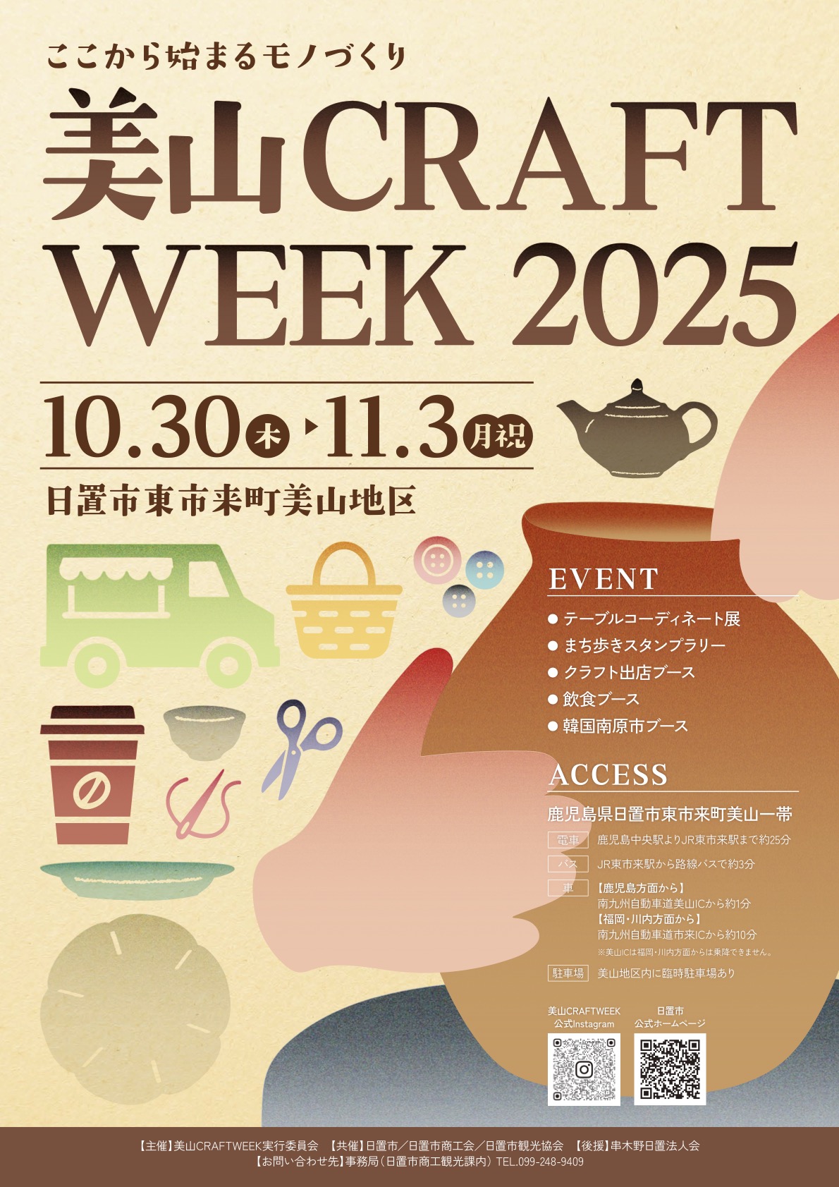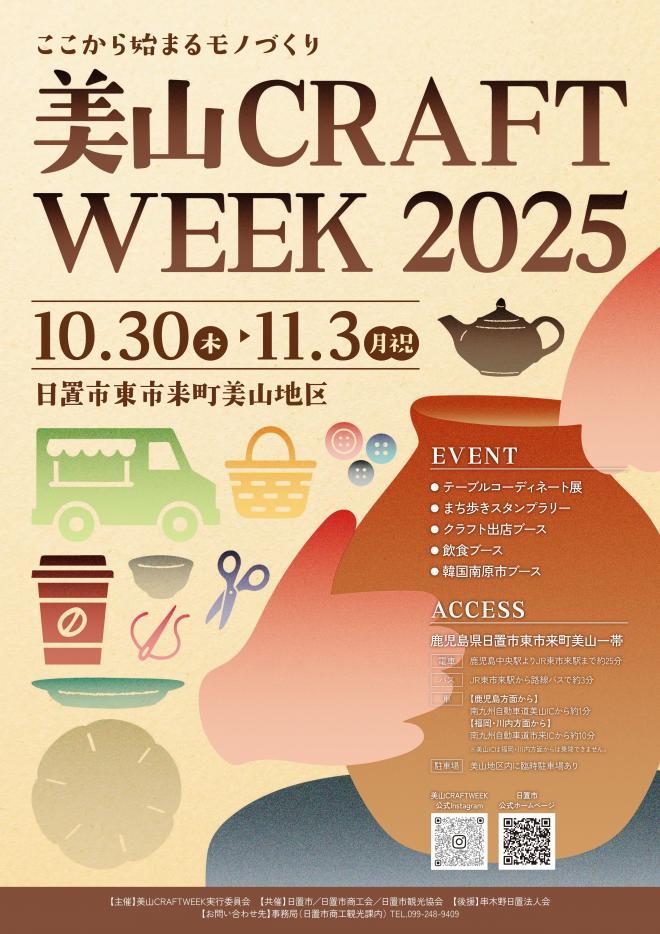 美山地区は、美山窯元祭りの開催や地域と行政が一体となったまちづくりによって、「薩摩焼の里」として広く知られるようになりました。窯元だけでなく、工房、ギャラリー、飲食店、カフェなどの多様な店舗が集まり、「クラフトのまち」へと成長しました。しかし、感染症の流行によって「美山窯元祭り」が中止となり、その代替え企画として、2020年(令和2年)に個人周遊・店舗訪問型の「美山CRAFTWEEK」を開催しました。以降、作品だけでなく、人(個性豊かな作家や職人、おもてなし精神の地域住民)や、町並み(落ち着きのある風情漂う空間)など、美山の魅力を心ゆくまで楽しむことができるイベントとして、毎年10月下旬から11月上旬にかけて開催しています。