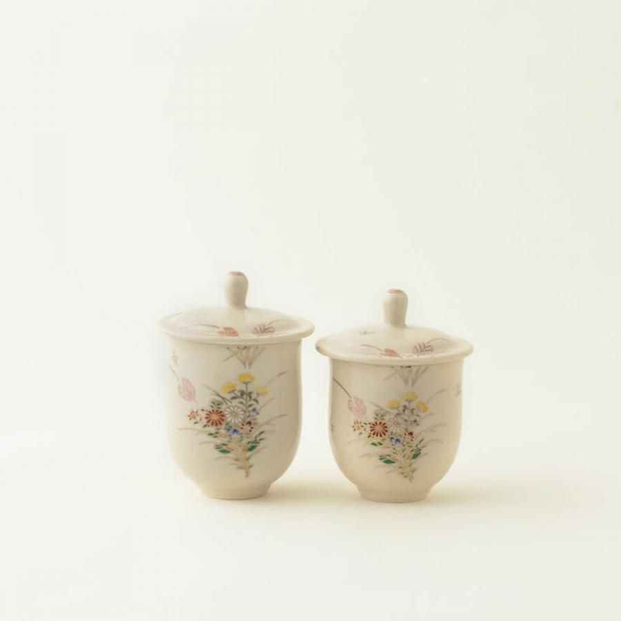 白薩摩蓋付夫婦湯呑(大)(小) 秋草[シロサツマフタツキユノミ アキクサ]