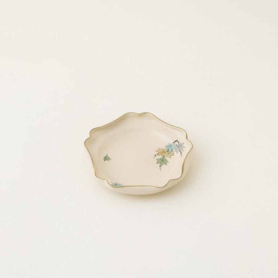 5枚の花びらが立体的なお皿に、涼やかな青紅葉を描きました。